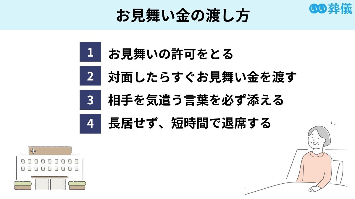 お見舞いに行ったら、対面してすぐにお見舞い金を渡します。このとき「お見舞い品の代わりなので、何かに役立ててください」と、相手を気遣う言葉を添えるのを忘れないことが大切。