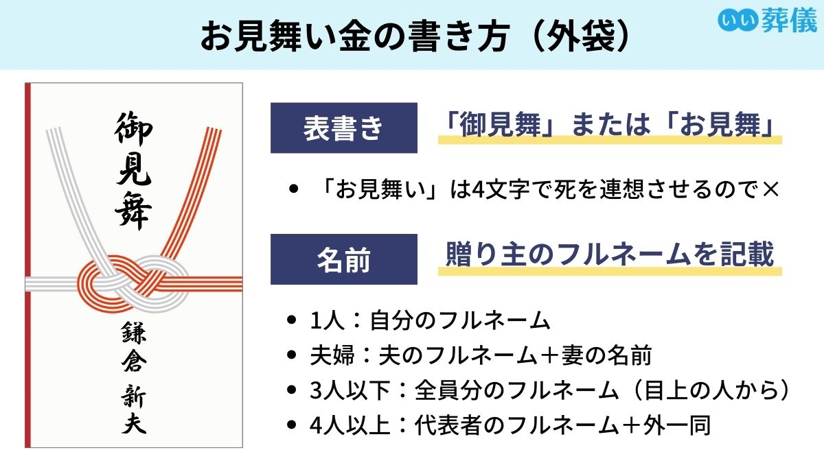 3人以下の連名で贈る場合は、立場や年齢の高い人から順番に名前を記載すること。夫婦や兄弟など、同じ名字の人と一緒に贈るなら、代表者以外は名前だけ記入するのが一般的です。4人以上でお見舞い金を贈る場合は、代表者のみフルネームで記載し、左側に「外一同」と書き加えます。