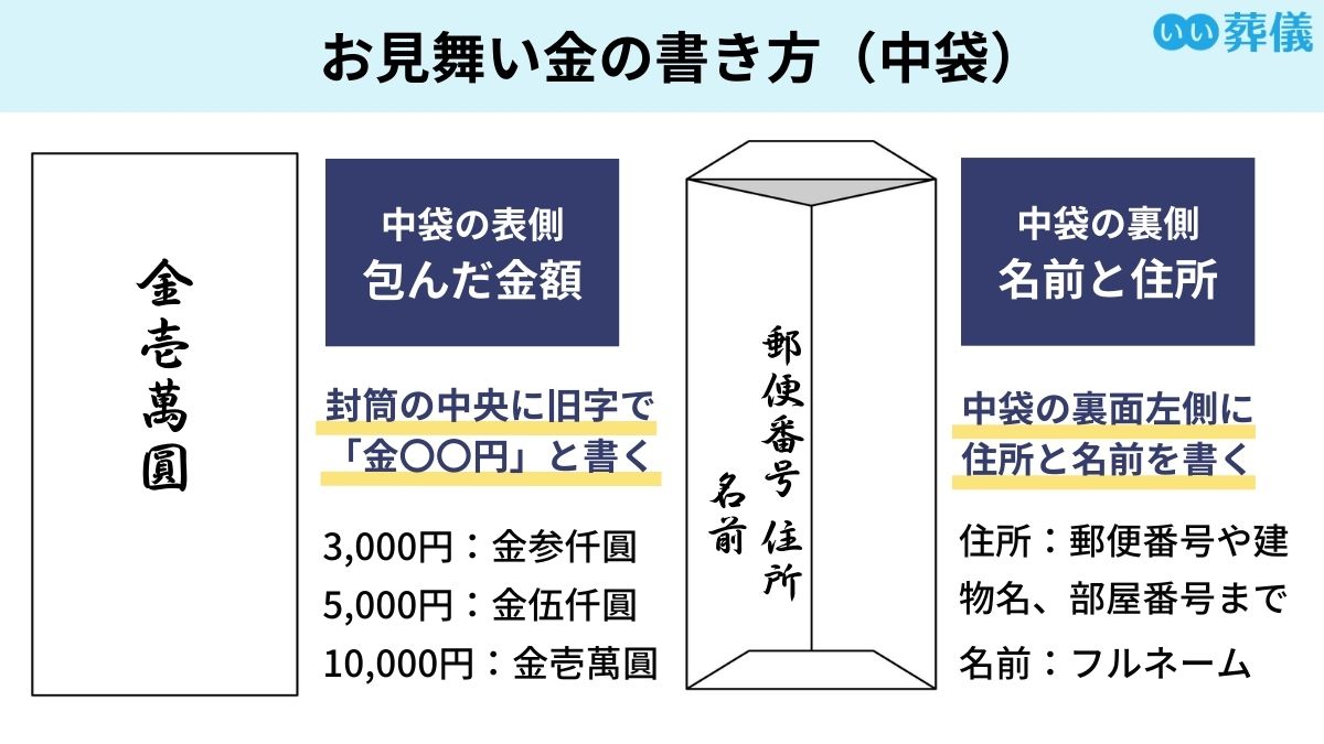 中袋の表側には、中央にお見舞い金として包んだ金額を記入します。「金参阡圓」「金伍仟圓」「金壱萬圓」など、旧字体を使って「金◯◯圓」と書くと丁寧です。