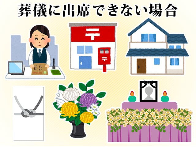 仕事の関係や、葬儀会場が遠方である、また体調が悪いなどの理由で、どうしても葬儀に出席できないこともあるかと思います。そんな時、次の方法で対応するといいでしょう。