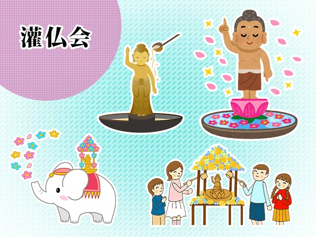 灌仏会は、お釈迦様の誕生日である4月8日に営まれます。花まつりや降誕会(ごうたんえ)、仏生会(ぶっしょうえ)、浴仏会(よくぶつえ)などとも呼ばれます。