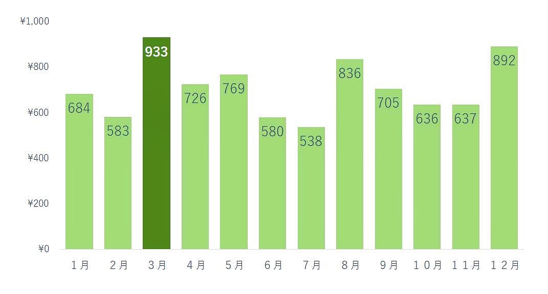 全日本菓子協会公表データ「平成30年1世帯当たり(2.98人)月別の菓子支出金額(二人以上の世帯・全国)」より/作図は鎌倉新書