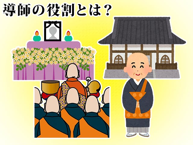 規模の大きな葬儀や法要では、大勢の僧侶が祭壇の前に整列し、荘厳な雰囲気の中で粛々と儀式が執り行われます。このとき法要の最高責任者として式を統括し、もっとも重要な作法を取り仕切る僧侶を「導師」と呼びます。迷える人びとに仏の教えを説き、正道(しょうどう:人としての正しい道)を教える役割から「引導僧(いんどうそう)」などの別名で呼ばれることもあります。