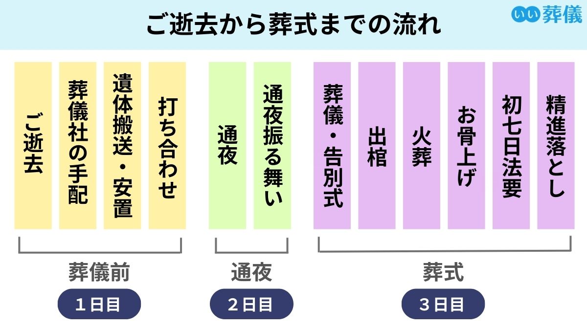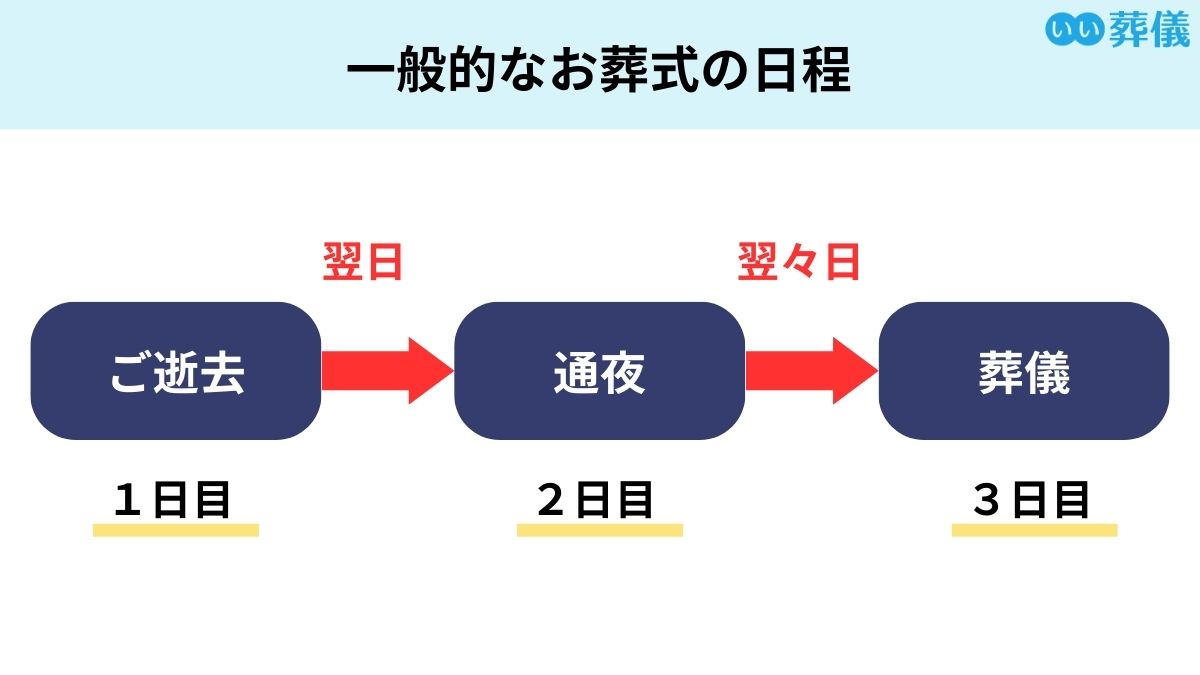 一般的な葬儀の日程は、故人が死亡した翌日に通夜、翌々日に葬儀・告別式を行います。日数でいうと、亡くなった日が1日目、通夜が2日目、葬儀・告別式が3日目です。