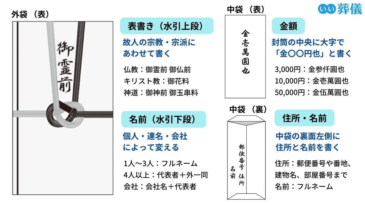 | 表書き | 御香料 御香典 御霊前 御仏前 御玉串料 御榊料 御花料 など |