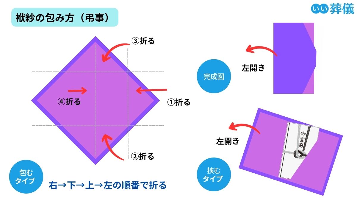 包むタイプの袱紗は、ひし形に広げて香典袋を置いたあと、右→下→上→左の順に端を折り、はみ出した左端を裏側に折り込みます。挟むタイプの袱紗は、左開きになるように香典袋を入れるだけでOKです。